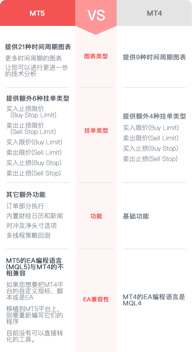 MT4平台提供了21种图表类型、38个内置指标和更丰富的历史回溯功能,支持更多种类的挂单类型
